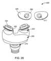 HFO源および/またはHFNCを含むいくつかの実施形態では、各ポスト20の上端がマグネット50などのマグネットを収容するように構成されたマグネットソケット52を含むことができる(実施例については図8を参照)。HFO源を含むいくつかの実施形態では、図3に示すように、シート25の下面はマグネット50と協働して、吸気口38でHFO源から受け取った流体がシート25のそれぞれの開口部を介して着用者の鼻孔に送達されるように、連続管路を提供する強磁性ドーム形状リング62を含むことができる。マグネット50がシート25の強磁性ドーム形状リング62に着脱自在に取り付けられると、各ポスト20の上端部、すなわち出口端部16は、着用者のノーズトリルの内部と流体連通している。ポスト20の下端部は呼吸流体が各ポスト20の出口端部16(すなわち、上側ポスト開口部)から各シート25の開口部17を通って着用者の鼻孔の内部に流れるように、鼻コネクタ90の内部と流体連通している。このように、各々のポストは、流体源(実施例として、HFNCを有する又は有さないHFO源)から被験者の鼻腔へ流体を運ぶための独特の経路を含む。マグネットソケット、ポストの第一端の周りに配置される。HFO源および/またはHFNCを含むいくつかの実施形態では、マグネットソケット52(すなわち、ポストの上面)は被験者の鼻孔上でのより良好な位置決めのために、シート25の強磁性ドーム形状リング62への取り付けを強化することを可能にするために、ポスト本体30に対して角度をつけることができる(一実施例として、図20で示されるように)。マグネットソケット52、マグネット50および開口部17も様々な断面形状をとることができる。HFO源および/またはHFNCを含む1つまたは複数の実施形態によれば、磁気リングの上面は傾斜している。HFO源および/またはHFNCを含むそのような実施形態では、磁気リングが磁気リングの異なる領域において異なる厚さを有することができる。In some embodiments including an HFO source and/or HFNC, the upper end of each