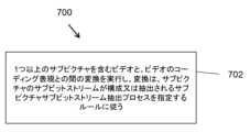 本文献は、ビデオコーディング技術に関する。具体的には、サブピクチャシーケンスについてのレベル情報を指定及びシグナリングすることについてのものである。概念は、単一レイヤビデオコーディング及びマルチレイヤビデオコーディングをサポートするいずれかのビデオコーディング標準又は非標準ビデオコーデック、例えば、開発中のバーサタイルビデオコーディング(VVC,  Versatile  Video  Coding)に適用されてもよい。  1. Introduction This document relates to video coding technology. In particular, it is about specifying and signaling level information for sub-picture sequences. The concepts may be applied to any video coding standard or non-standard video codec that supports single-layer and multi-layer video coding, such as the Versatile Video Coding (VVC) under development.
