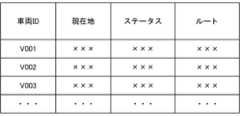 次に、車両情報DB312に格納される車両情報の構成について、図5に基づいて説明する。図5は、車両情報DB312のテーブル構成を例示した図である。車両情報テーブルは、車両ID、現在地、ステータス、及び、ルートの各フィールドを有する。車両ID