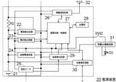 図4は、電源装置20の回路ブロック図である。電池セル21は、リチウムイオン二次電池等の充電可能な任意の数の電池セルである。電流検出回路22は、電池セル21の出力電流の経路に設けられた抵抗R2の両端の電圧により、電池セル21の出力電流を検出し、制御部27に送信する。電圧検出回路23は、電池セル21の出力電圧を検出し、制御部27に送信する。制御電源回路24は、電池セル21の出力電圧を、制御部27等の電源電圧に変換して出力する。温度センサ25は、電池セル21の近傍に設けられる。Figure 4 is a circuit block diagram of the power supply device 20. The