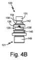 図4Aは、プローブマウント120の斜視図である。図4Bは、プローブマウント120の背面図であり、ノッチ138を備えるフランジ136を示している。図4Cは、プローブマウント120の正面図であり、ギャップ158を備えるフランジ136を示している。図4A~4Cは、一括して説明される。図4A~4Cは、プローブマウントボディ121、ピンスロット129、クラウン131、フランジ136、フランジ137、ノッチ138、動的溝142、静的溝146、ギャップ158、装着端部149、動的溝第1端部154、動的溝第2端部156及びギャップ158を含む、プローブマウント120を示している。Figure 4A is a perspective view of the