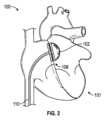供給ライン110が示されており、これらを介して、流体または気体が、加圧要素102のバルーン実施態様の拡張または収縮のために供給または除去され得、またはこれらによって、制御信号が加圧要素102の他の実施態様の操作のために提供され得る。供給ライン110は、加圧要素102を左心房LAに送達するために使用される細長いカテーテル本体に組み込まれても、またはその一部であってもよい。例えば、バルーンおよび非バルーンの両方の実施形態において、いくつかの態様では、カテーテルまたはシースが、大腿静脈を介して経皮的アプローチで送達され、下大静脈を通って右心房RAに進み、心房中隔を越えて左心房LAに進んでもよい。加圧要素102は、細長い本体の遠位端部に配置され、LA内で拡張することができる。図2でバルーンの近位に示されている拡張可能な心房位置決め構造106は、LA内でバルーンを固定するのを助けるために、中隔の左側および/または右側で拡張してもよい。いくつかの実施形態では、バルーンを運ぶカテーテル本体は、RAとLAとの間に配置された別個の経中隔シースを介して送達されてもよい。