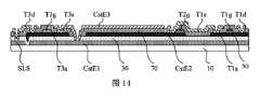 以上により、透明表示パネルの画素構造が基本的に完成する。図4~20に示すように、1つの画素Pについて、画素Pの表示領域DAでは、第1のサブ画素駆動回路SPC1、第2のサブ画素駆動回路SPC2、第3のサブ画素駆動回路SPC3および第4のサブ画素駆動回路SPC4は、ベース基板10に平行な第1の方向Xに沿って順次に並んでおり、いずれも前記第1の方向Xに垂直な第2の方向Yに延びている。第1のサブ画素駆動回路SPC1、第2のサブ画素駆動回路SPC2、第3のサブ画素駆動回路SPC3および第4のサブ画素駆動回路SPC4のそれぞれにおいて、検知トランジスタT3、蓄積容量CstおよびスイッチングトランジスタT1が第2の方向Yに沿って順次に配列され、検知トランジスタT3およびスイッチングトランジスタT1は、蓄積容量Cstの両側にそれぞれ位置する。第1のゲート線GL1は、スイッチングトランジスタT1における蓄積容量Cstから遠い側に位置し、第2のゲート線GL2は、検出トランジスタT3における蓄積容量Cstから遠い側に位置する。第1のアノード1201、第2のアノード1202、第3のアノード1203および第4のアノード1204は、表示領域DAにおいて、2×2行列に配置されている。具体的には、第1のアノード1201は、2×2の行列の左上に位置し、第1のアノード1201のベース基板10での正投影が、第1のサブ画素駆動回路SPC1及び第2のサブ画素駆動回路SPC2における検出トランジスタT3のベース基板10での正投影を覆い、第1のサブ画素駆動回路SPC1及び第2のサブ画素駆動回路SPC2における蓄積容量Cstの検出トランジスタT3に近い部分のベース基板10での正投影を覆い、すなわち、第1のサブ画素駆動回路SPC1及び第2のサブ画素駆動回路SPC2における蓄積容量Cstの第1の部分Cst1のベース基板10での正投影を少なくとも覆う。第2のアノード1202は、2×2の行列の左下に位置し、第2のアノード1202のベース基板10での正投影が、第1のサブ画素駆動回路SPC1及び第2のサブ画素駆動回路SPC2におけるスイッチングトランジスタT1のベース基板10での正投影を覆い、第1のサブ画素駆動回路SPC1及び第2のサブ画素駆動回路SPC2における蓄積容量CstのスイッチングトランジスタT1に近い部分のベース基板10での正投影を覆い、すなわち第1のサブ画素駆動回路SPC1及び第2のサブ画素駆動回路SPC2における蓄積容量Cstの第2の部分Cst2のベース基板10での正投影を覆う。第3のアノード1203は、2×2の行列の右下に位置し、第2のアノード1202のベース基板10での正投影は、第3のサブ画素駆動回路SPC3及び第4のサブ画素駆動回路SPC4におけるスイッチングトランジスタT1のベース基板10での正投影を覆い、第3のサブ画素駆動回路SPC3及び第4のサブ画素駆動回路SPC4における蓄積容量CstのスイッチングトランジスタT1に近い部分のベース基板10での正投影を覆い、すなわち、第3のサブ画素駆動回路SPC3及び第4のサブ画素駆動回路SPC4における蓄積容量Cstの第2の部分Cst2のベース基板10での正投影を覆う。第4のアノード1204は、2×2の行列の右上に位置し、第4のアノード1204のベース基板10での正投影が、第3のサブ画素駆動回路SPC3及び第4のサブ画素駆動回路SPC4における検出トランジスタT3のベース基板10での正投影を覆い、第3のサブ画素駆動回路SPC3及び第4のサブ画素駆動回路SPC4における蓄積容量Cstの検出トランジスタT3に近い部分のベース基板10での正投影を覆い、すなわち、第3のサブ画素駆動回路SPC3及び第4のサブ画素駆動回路SPC4における蓄積容量Cstの第1の部分Cst1のベース基板10での正投影を覆う。The pixel structure of the transparent display panel is basically completed as described above. As shown in Figures 4 to 20, for one pixel P, in the display area DA of the pixel P, the first subpixel driving circuit SPC1, the second subpixel driving circuit SPC2, the third subpixel driving circuit SPC3, and the fourth subpixel driving circuit SPC4 are arranged in sequence along a first direction X parallel to the