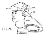 トランスデューサアレイ10a及び10bは、頭部の両側から患者の頭蓋内へと超音波を送信するが、頭部の前部又は頭蓋骨の背部の後頭下の音響窓といった他の場所を使用してもよい。大多数の患者の頭部の側部が、頭部の両側の耳の周り又は上方の側頭骨における経頭蓋超音波検査に適した音響窓を有利に提供する。様々な身体部分に適用される他の超音波治療とは対照的に、頭蓋骨において適切な音響窓を提供するアクセス面積は限られている。本発明は、皮膚表面における瞬時音響出力を有利に低減し、これにより、患者の安全性を向上させる。これらの音響窓を介してエコーを送受信するために、トランスデューサアレイは、これらの場所において、優れた音響的接触状態になければならないが、これは、トランスデューサアレイを頭部に対してヘッドセットで保持することにより行われる。例えば図2aは、マネキン人形の頭部60に取り付けられた2つのマトリクスアレイプローブ10用のヘッドセット62を示す。大多数の患者の頭部の側部は、頭部の両側の耳の周り及び耳の前の側頭骨における経頭蓋超音波検査に適した音響窓を有利に提供する。これらの音響窓を介してエコーを送受信するために、トランスデューサアレイは、これらの場所において、優れた音響的接触状態になければならないが、これは、トランスデューサアレイを頭部に対してヘッドセット62で保持することにより行われる。ヘッドセットは、トランスデューサアレイがその共形接触面によって操作されることを可能にし、脳内の動脈に向けられる一方で、側頭部窓に対する音響的接触を維持するスナップ式の変形可能な音響スタンドオフ44を有する。図示されるプローブ10は、プローブハンドルを90°曲げることによって湾曲され、これにより、プローブは、その重力中心が頭部及びヘッドセットに近づくので、ヘッドセット62に取り付けられるとより安定する。音響的結合は、プローブハンドルに嵌合球面を組み込むことによって容易にされる。これは、プローブが、患者の側頭部窓にしっかりと結合されるまで、ヘッドセット62内でピボットすることを可能にする。The