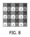 図7に、図6と同じグリッド及びボリュームの3パス走査シーケンスが示される。第1のビームパターンのビーム「1」は、2つのグリッド位置だけ水平方向に、1つのグリッド位置だけ垂直方向に離間されて交互配列で送信される。第2のビームパターンのビーム「2」も、2つのグリッド位置だけ水平方向に、1つのグリッド位置だけ垂直方向に離間されて第1のビームパターンからオフセットされるパターンで同様に送信される。第3のグリッドパターンのビーム「3」は、第1及び第2のビームパターンとは異なるパターンでオフセットされ、ここでも、互いから、2つのグリッド位置だけ水平方向に、1つのグリッド位置だけ垂直方向に離間されてグリッドの残りの位置を埋める。この3パスビームパターンシーケンスも、グリッド領域全体に超音波照射することが分かるが、不所望な隣接VAR破壊を回避し、したがって、これらのVARが後続のビームパターンによって効果的に治療的に破壊できるように各パターンのビームは間隔があけられている。前の例と同様に、血栓位置への新しいVARの流入を可能とするように、リフレッシュ時間が連続パターン間に許容されている。7 shows a three-pass scan sequence of the same grid and volume as in FIG. 6. Beams "1" of the first beam pattern are transmitted in an alternating arrangement, spaced two grid positions horizontally and one grid position vertically. Beams "2" of the second beam pattern are similarly transmitted in a pattern offset from the first beam pattern, spaced two grid positions horizontally and one grid position vertically. Beams "3" of the third grid pattern are offset in a different pattern from the first and second beam patterns, again spaced two grid positions horizontally and one grid position vertically from each other to fill in the remaining positions of the grid. It can be seen that this three-pass beam pattern sequence also insonifies the entire grid area, but the beams of each pattern are spaced apart to avoid undesired adjacent VAR destruction so that these VARs can be effectively therapeutically destroyed by the subsequent beam pattern. As in the previous example, refresh time is allowed between successive patterns to allow for the influx of new VARs to the thrombus location.