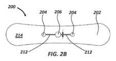 図2A及び図2Bに示す付属デバイス200は、本発明の開示に従って実施することができるサイズ及び/又は形状の多くの変形の一例を示している。図1A及び図1Bに示す付属デバイスと比較して付属デバイス200は、より細長く、より幅狭の幅を定める。開口204、206はまた、付属デバイス100の周囲開口108及び中心開口116とは異なり、付属デバイス200の中心部分付近に含まれ、開口は、異なる数及び種類の細長介入デバイスを受け入れるように異なる実施形態では位置、数、及び/又はサイズが変動する可能性があることを示している。