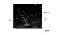 なお、針200の表面には、あらかじめ定めたパターンで超音波の反射特性が変化する加工を施せばよい。図24は、超音波の反射特性が変化するパターンを施した針を対象物に刺し、超音波で検知している様子を示している。針200の先端221,222とパターンが検出できていることが分かる。このように、針に超音波の反射特性が変化するパターンを施せば、磁性マーカ100を配置する位置を認識しやすい。同様に、磁性マーカ100に、あらかじめ定めたパターンで超音波の反射特性が変化する加工を施してもよい。例えば、第1ロッド110、第2ロッド120、第3ロッド130で異なるパターンを施せば、磁性マーカ100を配置した際に、磁性マーカ100の配置の状態を認識できる。針200と磁性マーカ100の両方に、あらかじめ定めたパターンで超音波の反射特性が変化する加工を施してもよいし、一方にのみ加工を施してもよい。The surface of the