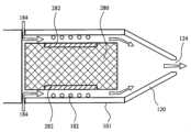 図14は第七の実施形態を図示したものである。図14ではシステムの前部端のみが、吸入検出メカニズムを含めて図1に示すものと同一の電池および制御電子回路を使用できるものとして表示されている。図14では、装置は図12に示すものと類似した構造を持つ。ただし図14のカートリッジは、エアロゾル形成基体で浸されたサセプタ素子280で充填されている。カートリッジのハウジングは、気化したエアロゾル形成基体がカートリッジから漏れ出るのを許容する蒸気浸透性膜282を含む。蒸気浸透性膜282は、空気吸込み口184から空気出口124へ延びる気流チャネルに隣接して配置される。14 illustrates a seventh embodiment. Only the front end of the system is shown in FIG. 14, which may use the same battery and control electronics as shown in FIG. 1, including the inhalation detection mechanism. In FIG. 14, the device has a similar structure to that shown in FIG. 12, except that the cartridge in FIG. 14 is filled with