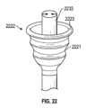 図22は、折り畳み式円錐形封止材2222の等角図であり、段々に並んだリッジ2221又はエッジが円周の周囲に広がっている。遠位リング2223は、子宮のほうを向くように設計されてよい。折り畳み式円錐形の設計により、器具が挿入されたときには遠位リング2223の周囲に封止が発生することが可能であり、更に、必要であれば、封止材2222を押し退けることなく、器具をより遠くまで(遠位方向に)挿入することが可能である。Figure 22 is an isometric view of a