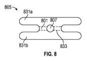 図8は別の例示的挿入可能器具805を示しており、これは器具605と似ており、異なるのは、リッジ831a、bのペアを2つだけ含む点である(これらのペアは、互いに対して約180度離れて配置されている)。リッジ831a、bのペアの個々のリッジ831a、bの間のシャフト833内の穴801は、器具の一方の側から中心真空チャネル807を通ってもう一方の側まで延びる貫通穴であってよい。挿入可能器具805は、互いに対して約180度離れている2組のリッジしかないことから、ほぼ平坦でありうる。この設計により、一方向(即ち、短軸方向)の可撓性即ち曲げやすさが別の方向(即ち、長軸方向)に比べて強化されうる。8 shows another exemplary