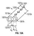 別の例示的挿入可能器具1205を図12A~12Bに示す。器具1205はシャフト1233を含み、これはほぼ直線状であって、隣り合って平行に延びる2つの管状セクション1212a、1212bを含む。各管状セクション1212a、bは、その中を延びる真空チャネル1207a、bを含む。2つの管状セクション1212a、bの間の接合によって、それらの間に長手方向の谷間1221a、bが形成されており、そこに穴1201が配置されてよい(即ち、穴1201は2つの真空チャネル1207a、bとつながっている)。長手方向の谷間1221a、b内に穴1201を配置することは、有利なことに、組織が穴1201に引き込まれないようにすることに役立ちうる。幾つかの実施形態では、真空チャネル1207a、bのそれぞれの径dvは3~6mm(5mm等)であってよく、真空チャネル1207a、bの間の距離dbは1~3mm(1.5mm等)であってよく、穴1201の径は2~5mm(3mm等)であってよい。  Another exemplary