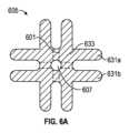 図6A~6Bは、別の例示的挿入可能器具605を示す。器具605は器具305と似ており、異なるのは、シャフト633の4つの面のそれぞれに2つの平行なリッジ631a、bを含む点である。図に示すように、リッジ631a、bの各ペアは、隣接するペアから約90度離れて配置されてよい。穴601は、平行なリッジ631a、bの各ペアの個々のリッジ631a、bの間のシャフト633内を延びてよい。更に、幾つかの実施形態では(図6A~6Bに示すように)、穴601は、貫通穴であってよく、それによって、シャフト633の一方の側から真空チャネル607を通って別の側まで完全に突き抜けることが可能である。しかしながら、隣接する穴601同士は、(図6Bに示すように)長手軸方向にオフセットしていてよい。これは、器具605の保全性を確保する為である。6A-6B show another exemplary