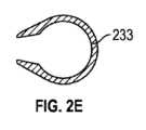 図2A~2Iに戻ると、遠位部220は可撓ループ状部分223を含み、これは、子宮に送達されるときはしぼみ、その後、自己膨張して、子宮になじむループ形状になる。更に、ループ状部分223は、内側ループ状部分232及びシールド233を含む。内側ループ状部分232は、近位部225と連続しており、近位部225に流体接続されている。内側ループ状部分232は、その内周部に複数の穴229を含み、これは(真空チャネル231との接続を介して)穴229を通して真空を与える為である。例えば、10~30個の穴229(例えば20個の穴229)があってよい。複数の穴229は、使用中に1つ以上の穴が塞がった場合の為の冗長性を備えることに役立ちうる。シールド233は、内側ループ状部分232の外周部に順応し、外周部の周囲に折り重なることが可能である。例えば、シールド233は、内側ループ状部分232の外周部のうちの270~320°の部分の周囲に広がってよい。更に、シールド233のエッジは、内側ループ状部分232より0.02~0.20”の距離だけ(例えば0.04~0.15”だけ、例えば約0.08”だけ)半径方向内側に延びてよい。シールド233のオーバハングしたエッジは、有利なことに、真空が穴229を通して引き込まれる際に穴229が組織によって塞がれないように保護されることに役立ちうる。Returning to FIGS. 2A-2I, the