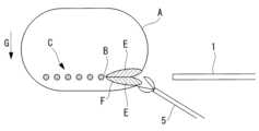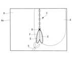 ステップS21において、図6に示されるように、制御装置3は、内視鏡画像Dに画像処理を施すことによって、マーキングCと、切離面EのエッジFとを認識する。マーキングCおよび切離面Eは、処置対象Aの外面および周辺組織とは異なる色を有するので、制御装置3は、色に基づいてマーキングCおよび切離面Eを認識することができる。このとき、画像処理によって両側の切離面Eを相互に区別して認識することは難しく、両側の切離面Eは1つの面として認識される。したがって、エッジFは、単一の線として認識される。In step S21, as shown in Fig. 6, the