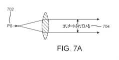 図7Aは、いくつかの実施形態に従った、1つまたは複数の幾何学的要因によって引き起こされるいかなるビーム発散もない、完全なコリメーションの例示的な理想ケースを示す図である。図7Bは、いくつかの実施形態に従った、1つまたは複数の幾何学的要因によって引き起こされる例示的なビーム発散を示す図である。図7Cは、いくつかの実施形態に従った、1つまたは複数の幾何学的要因によって引き起こされる例示的なビーム発散を示す図である。図7Aの理想的なレンズについては、達成可能な光ビームコリメーションは、2つの幾何学的要因、すなわち、光源のサイズと、レンズの焦点長とに依存する。いかなるビーム発散もない完全なコリメーション704は、単一色点光源(PS)702が、理想的な正レンズから焦点長の距離に正確に配置される、理論的ケースにおいてのみ達成することができる。このケースが、図7Aに描かれている。残念ながら、すべての現実の光源は、それらを拡張された光源(ES)にする、光が放射されるいくらかの表面積を有する。源の各点は、レンズによって別々に結像されるので、全ビームは、レンズの後でいくらか異なる方向に伝搬する、コリメートされたサブビームのグループから成ることになる。図7Aから図7Cに示されるように、源が、712、722のように、より大きくなるにつれて、全ビーム発散714、724は、増大する。この幾何学的要因は、一般に、いかなる光学的手段を用いても回避することができず、それは、相対的に大きい光源を用いた場合に、ビーム発散を引き起こす、支配的な特徴である。7A is a diagram illustrating an exemplary ideal case of perfect collimation without any beam divergence caused by one or more geometric factors, according to some embodiments. FIG. 7B is a diagram illustrating an exemplary beam divergence caused by one or more geometric factors, according to some embodiments. FIG. 7C is a diagram illustrating an exemplary beam divergence caused by one or more geometric factors, according to some embodiments. For the ideal lens of FIG. 7A, the achievable light beam collimation depends on two geometric factors: the size of the light source and the focal length of the lens.
