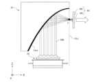 次に、図8Aおよび図8Bを参照して、本開示における非球面を有する集光部の変形例を説明する。図8Aおよび図8Bは、光源20から出射されたコリメートビーム20bが、変形例における放物面反射鏡31によって収束され、波長変換部40における透光領域40tの光入射面40s1に入射する様子を模式的に示すY方向から見た側面図である。図8Aおよび図8Bでは、基板10および筐体50の記載は省略されている。変形例における放物面反射鏡31は、放物面形状の反射面31mを有している。反射面31mは、放物面の軸31a(Z方向)に対して平行に進行する光を反射して軸31a上にある集光点Fに収束させる。図8Aおよび図8Bに示す反射面31mのすべての部分がある必要はなく、光が当たる部分だけがあればよい。放物面反射鏡31における反射面31m以外の部分の形状に制限はない。図8Aおよび図8Bに示す例では、光源20は、2行5列に配列されたコリメートビーム20bをZ方向に出射する。透光領域40tの光入射面40s1は、放物面反射鏡31の反射面31mによって反射された5つのコリメートビーム20bのうち、真中のビームの光軸に対して垂直である。  (Modification of light collecting part having aspheric surface)