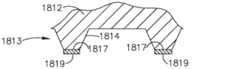 依然として図4を参照すると、少なくとも1つの形態のアンビル1810は、水平に突出し、細長通路1602の近位端部分1610の直立壁1622に形成された、対応するトラニオンクレードル1614の中に枢動可能に受容される、一対のアンビルトラニオン1822を有するアンビル固定部分1820を含む。アンビルトラニオン1822は、通路キャップ又はアンビル保持装置1630により、対応するトラニオンクレードル1614内で枢動可能に保持される。アンビル固定部分1820は、シャフト軸SAを横断する、固定されたアンビル枢動軸を中心にしたアンビル固定部分1820に対する選択的な枢動移動のために、細長通路1602の上で、移動可能に、又は枢動可能に支持される。図6及び図7に示すように、少なくとも1つの形態において、アンビル1810は、例えば導電性金属材料から作製されるアンビル本体部分1812を含み、中にナイフ部材1330を摺動可能に収容するように構成された中央に配置されたアンビルスロット1815の各側面に、中に形成された一連の締結具形成ポケット1814を有するステープル形成下面1813を有する。アンビルスロット1815は、アンビル本体1812を通って長手方向に延びる上部開口部1816へと開口し、発射の間、ナイフ部材1330上にアンビル係合特徴部1336を収容する。従来の機械式外科用ステープル/締結具カートリッジ1400が細長通路1602内に取り付けられると、ステープル/締結具は組織Tを通って駆動され、対応する締結具形成ポケット1814との接触を形成する。アンビル本体1812は上部に開口部を有し、例えば取り付けを容易にすることができる。アンビルキャップ1818を中に挿入し、アンビル本体1812に溶接して開口部を取り囲み、アンビル本体1812の全体の剛性を改善することができる。図7に示すように、RFカートリッジ1700と共にエンドエフェクタ1500の使用を容易にするために、締結具形成下面1813の組織に面しているセグメント1817は、その上に電気絶縁性材料1819を有してよい。4, at least one form of