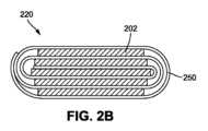 図2A~図2Bは、そこに沿って延びる狭幅な導電性トレース252を備えた可撓性シートを有する加熱素子250の実施形態を含む気化器カートリッジ220の実施形態を示す。これらの狭幅な導電性トレース252は、直列または並列に配置することができる抵抗性ヒーターを形成する。狭幅な導電性トレース252は、本明細書に記載される導電性材料のいずれかなどの導電性材料から作製することができる。加熱素子250は、狭幅な導電性トレースと電気的に通信する少なくとも1つのカートリッジ接点224を含むことができる。このカートリッジ接点224は、気化器カートリッジ220が気化器本体に結合されたときに、カートリッジ接点224が(図1に示される)気化器本体の受け口接点125と係合できるように位置決めすることができる。これは、気化器本体からのエネルギーを気化器本体から狭幅な導電性トレース224に(カートリッジ接点224と受け口接点125との間の接触接続を介して)伝達させることができ、それにより、狭幅な導電性トレース252を所望の温度範囲内の温度に到達させることができる。2A-2B show an embodiment of a