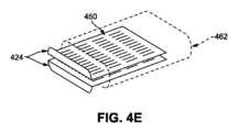 図4Cに示されるように、加熱素子450は、原料物質402が直接対向することができる少なくとも1つの平坦な表面を含むことができ、それにより、加熱素子450と原料物質402(例えば1つ以上のタバコシート)との間の効率的な熱伝達が提供される。さらに、そのような構成では、原料物質402にわたる温度勾配を最小にすることができる(例えばタバコシートの幅以下)。これは、加熱素子450に、チャンバ内の原料物質402内に含有される気化可能材料のすべてまたは実質的にすべてを効率的に気化させながらも所望の温度範囲内の温度に加熱することを可能にさせる。(図4Eに示されるように)遠位端から延在するカートリッジ接点424で加熱素子450を半分に折り畳むなど、加熱素子450の他の変形形態および/または特徴を含めることができ、かつ/または(例えば図4Dに示されるように)所望の加熱範囲内への加熱素子450の高速かつ効果的な加熱を達成するのに十分な電気抵抗を結果としてもたらすための効果的に長くて薄いエッチングされた導電性シート406を含めることができる。As shown in FIG. 4C, the