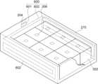 図11は、カード用引き出し220の一例の斜視図である。図11の例のカード用引き出し220は、パッケージ302を幅方向に3つ、奥行き方向に3つ収容可能な大きさを有し、最大で9つのパッケージ302を収容可能である。カード用引き出し220の左右の側壁には、パッケージ302に付されたRFIDタグ306を読み取るためのカード用アンテナ602が内蔵されている。なお、カード用アンテナ602は、側壁の内側面に張り付けられていてもよい。Figure 11 is a perspective view of an example of a