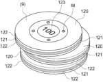 次に、本発明の実施の形態のチップについて説明する。図4は、チップ3の積み重ねられた状態の斜視図であり、図5は、チップ3の側断面図である。図4に示すように、チップ3は、共通色層122の表面(上面と下面)にチップ3の種類(価値)を表す印刷123(100ポイントなど)が施され、最外層に透明層120が設けられ、各層間が熱圧着されて少なくとも5層構造をなしている。これらのチップ3は、細長い長尺状のプラスチック材料を用い、長尺の状態で各層(指定色層121、共通色層122、透明層120)の間が熱圧着されて密着した状態(5層構造等)を形成し、その後にプレス等により円形あるいは長方形等に打ち抜いて形成される。プレスにより打ち抜く際に打ち抜きのための金型のダイとポンチの寸法を設計して最外層の透明層120の端にR加工(丸い角)が施される。<Chip description>