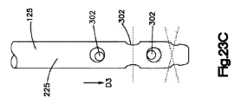 同様に図23A~図23Cを参照すると、IM釘225は、IM釘225を解剖学的構造124に固着又は固定するために、それぞれの係止ねじ304を受容するようにサイズ決めされた複数の係止孔302を画定し得る。第1のX線画像400aに示されるIM釘225の該一部分は、係止孔302の一部分、例えば、複数の係止孔302のうちの少なくとも2つの係止孔の一部分を含み得る。X線の進行方向128は、X線画像400aが取得される第1の方向又は視点を画定し得る。IM釘225は、第2の方向D2に沿った幅と、該第2の方向D2に実質的に垂直である第3の方向D3に沿った長さと、を画定し得る。第1のX線画像400aに映し出される係止孔302は、IM釘225の長さに沿って互いに離間され得る。医療用撮像装置104が第1のX線画像400aを生成する第1の位置にあるとき、X線の進行方向128は、少なくとも2つの係止孔302の一部分がX線画像400a上でそれぞれの楕円又はレンズ306として視認可能であるように、第2及び第3の方向D2及びD3の少なくとも1つ、例えば、両方と比較して、非直交であり得る。レンズは、それらの終端点で画定された2つの半円を画定し得ることが理解されよう。23A-23C, the