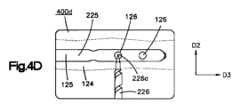 ディスプレイ212は、とりわけ、IM釘打ち手術と関連するX線透視画像を表示することができる。ディスプレイ212は、遠位係止孔を穿孔すること、又は骨内にIM釘を配置することに関連する情報を表示することができる。更に、ディスプレイ212は、深さゲージ250と関連する画像又はデータを表示することができる。更に、ディスプレイ212は、ディスプレイ212がX線透視画像をレンダリングするのと同時に、深さゲージ250と関連する画像若しくはデータ並びに/又はIM釘打ち手術に関する情報を表示することができる。ディスプレイ212は、X線透視画像、例えば、医療用撮像装置104によって生成され、医療用撮像装置104から受信された、解剖学的構造124の例示的なX線透視画像400a~400dを表示するように構成され得る。特に図4Aを参照すると、ディスプレイ212、例えば第1のディスプレイ212aは、解剖学的構造124内の埋没物125の第1のX線画像400aを表示することができる。埋没物125は、解剖学的構造124から物質が取り除かれ得る1つ又は2つ以上の標的部位126を画定することができる。例示的なIM釘打ち手術では、画像装置104からのX線透視画像を表示するディスプレイ212を見ることによって、医療専門家は、図4Bに示すように、標的部位126が真円を画定するまで、患者とディスプレイ212とを同時に見ながら、患者又は撮像装置104を操作することができる。IM釘打ちの例では、1つ又は2つ以上の標的部位126が真円を画定するとき、ねじを係止するための孔を標的部位126において穿孔し得る。The
