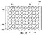 図14は、いくつかの実施形態に関連付けられ得る追加の詳細を図示する、図2のバブルマニホールド202の別の例の一部分の概略図である。バブルマニホールド202は、先に述べたバブルマニホールド202の実施形態と同様であり得るが、利用される特定の治療形態に好適であり得る、独立気泡を含むバブル210の異なる配置を含み得る。密封領域509によって画定された平面と同じ平面に形成された気泡の入れ子パターンを形成するように個々の気泡が交互の行の間で互いにより密接に入れ子にされ得るように千鳥配置である、独立気泡を含むバブル210が、図5に関して先に述べられている。図14は、互いに極めて近接する独立気泡を含む複数のバブル210を画定するパターンで互いに密封された内面を有する、ポリマーフィルムの2つのシート、すなわち、第1の層502と第2の層504とを含み得るバブルマニホールド202を描いている。しかしながら、図14のバブル210の行及び列は、交互にずらされるのではなく、むしろ、整列パターンで配設される。バブル210の直径及びピッチに応じて、気泡被覆率は、バブルマニホールド202の表面領域の約10%~約55%の範囲であってもよい。第1の層502及び第2の層504は、バブル210を画定する密封領域509において互いに封着されてもよい。この実施形態では、バブル210の行及び列は、整列パターンを形成するように一列に配設される。バブルマニホールド202はまた、上で説明したように穿孔され得る密封領域509を含み得る。いくつかの実施形態では、密封領域509は、バブル210間の複数の開口212であって、バブルマニホールド202を通って流体が流れるのを許容するように第1の層502と第2の層504の両方を貫通して延びる開口212を含み得る。開口212は、図5の開口212と同様の寸法を有し得る。バブル210のパターンは、様々な配置を有し得る。14 is a schematic diagram of a portion of another example of the