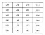 図6Bは、画像補正データ33gの例を示す。図6Bに示すように、画像補正データ33gは、表示領域220の複数の区画領域R11~R64のそれぞれに対して割り当てられた画像補正値U11~U64を含む画像補正テーブルを有する。画像補正テーブルにおいて、画像補正データ33gの画像補正値U11~U64は、それぞれ、表示領域220の複数の区画領域R11~R64に対応している。例えば、表示コンテンツIvが区画領域R22に表示される場合、画像補正値として画像補正値U22が採用される。Figure 6B shows an example of