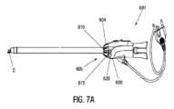 図7A及び7Bの参照において、いくつかの実施形態において、付勢部材605は、制御カラー604の外面に取り付けられた第1の制御レバー610とカニューレ100の制御ハンドル600の外面に取り付けられた対応する第2の制御レバー620を含む。弾性装置または弾性バンド615は、制御レバー610,620を接続するために用いられ、2つを圧縮状態に置くこと及び同様に切断部の間に圧縮力を働かせ切断部を保持することは、閉鎖形態である。7A and 7B, in some embodiments, the biasing