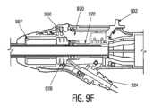 動作中、図9Fに示されるように、外電極サブアセンブリ920は、切断部を収縮するために収縮される。切断部を伸長するために、スライダ602は、遠位方向に進められ、遠位方向に外電極サブアセンブリ920を動かす。図9Gに示されるように、外電極サブアセンブリは、外アダプタ926が回転子サブアセンブリ901のストッパ907に押されるまで前に進められる。この点において、切断部は、例えば図8Aに示されるように、一緒に伸長された位置に進められる。次に、スライダ902は、さらに遠位方向に動かされ、圧縮性要素924を圧縮するために内アダプタ922を動かす。内アダプタ922のそのような動作は、またさらに遠位方向に内電極を動かす一方で、外電極908は静止したままである。この方法で、内電極904の切断部は、図8Bに示されるように、非常に伸長した位置に外電極908の切断部に対して長手方向に動かされる。In operation, as shown in FIG. 9F, the