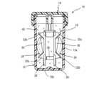 具体的には、容器本体12は、図1及び図2から明らかな如く、所定厚さの円筒状の筒壁部12aと、その下端部を閉塞する底部12bとから、構成されており、その筒壁部12aの上端開口部の外周部には、キャップ部材14が螺合せしめられる外側ネジ部12cが、設けられている。なお、ここでは、容器本体12の底部12bの中央部が、容器本体12内に突出せしめられて、円形の当接台座部18が設けられており、更に、この当接台座部18の中央部から筒壁部12a内に円錐体形状において突出する円錐形状部20が、一体的に形成されている。Specifically, as is clear from Figures 1 and 2, the