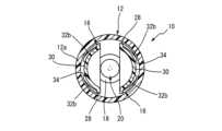 また、レンズホルダ56は、図5及び図6に示されるレンズホルダ16と同様に、ホルダ基部26と、その両側部から平行に垂下するように折曲せしめられる二つのホルダ本体28,28とを一体的に有する一体成形品として、形成されたものであるが、そこでは、図10(a)から明らかなように、二つのホルダ本体28,28は、その上部と下部において、それぞれ、その一方に設けられた筒状部38と他方に設けられたピン部40との嵌合によって、相互の間隔が一定となるようにして、固定せしめられている。このような筒状部38とピン部40の嵌合構造が、二つのホルダ本体28,28の上部と下部において設けられていることにより、それら二つのホルダ本体28,28の関係位置の固定が、より有効に行なわれ得るようになっているのである。Like the