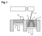 1.粉末(1)の微細な層をローラ(6)によってプレート(7)からピストン(8)まで広げて、粉末層(2)を形成する。パーツ(5)の製造開始時に、ピストン(7)は最も高い位置にある。