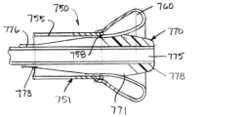 いくつかの実施例では、拡張器は、近位セグメントと、近位セグメントより遠位の遠位セグメントと、を含み得る。遠位セグメントは、近位セグメントよりも大きい最大直径を含むことができ、近位セグメントよりも大きい直径を含むことができる。遠位接触要素は、遠位セグメントから近位セグメントへの遷移を含み、プルリングと接触してプルリングを近位に並進させることにより、プルリングとの締まり嵌めを生じさせて、遠位先端部を漏斗形状に拡大させる力を伝達するように構成され得る。In some embodiments, the expander can include a proximal segment and a distal segment distal to the proximal segment. The distal segment can include a larger maximum diameter than the proximal segment and can include a larger diameter than the proximal segment. The distal contact element can include a transition from the distal segment to the proximal segment and be configured to contact the pull ring and translate the pull ring proximally to create an interference fit with the pull ring and transmit a force that expands the distal tip into a funnel shape.