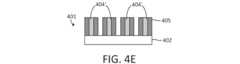 次に、動作315において、図4Eに示すように、第2のスペーサ層405がエッチバックされる。エッチバック動作は、第2のスペーサ層405を水平表面から除去するが、垂直表面上では実質的に保持する。第2のスペーサ層405は、第2のスペーサ層の材料をエッチングするように構成された、エッチング化学作用、プラズマ、及び指向性イオン流出の組み合わせに基板を曝露することによってエッチバックされてもよい。エッチングプロセスは、異方性エッチングプロセスである。Next, in