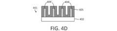 次に、動作313において、図4Dに示すように、第2のスペーサ層405が、第1のスペーサフィーチャ404’の上に堆積される。第2のスペーサ層405は、原子層堆積又は化学蒸着(いずれも、プラズマエネルギー又は熱エネルギーによって駆動され得る)により堆積されてもよい。第2のスペーサ層405は、酸化ケイ素、窒化ケイ素、酸化チタン、酸化スズ、酸化ジルコニウム、酸化ハフニウムなどの誘電体材料であってもよい。一般に、第1のスペーサ層404の材料は、第2のスペーサ層405の材料とは異なる組成を有するべきである。様々な材料の組み合わせを、第1のスペーサ層404及び第2のスペーサ層405に使用できる。Next, in