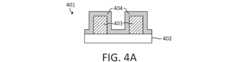 まず、動作301において、基板401を受け取る。基板401は、下地材料402と、コア403と、第1のスペーサ層404とを含む。第1のスペーサ層404は、図4Aに示すように、コア403をコンフォーマルに被覆する。一般的に、従来の材料がこれらの層の各々に使用されてよい。一実施形態では、コアは、灰化プロセス中に望ましくない残留材料を残すことなく灰化可能な材料で作製され、又はそのような材料を含むことができる。本明細書において定義されるように、灰化プロセスは、熱、又は、酸素含有プラズマ若しくは水素含有プラズマなどのプラズマに曝露することにより、フォトレジストなどの1つ又は複数の有機材料を除去する剥離処理の一種を指す。一例では、コアの材料は、例えば、炭素、シリコン、ゲルマニウム、スズ、鉛などの周期表のIVA族を含むことができ、又はそれらから選択することができる。いくつかの例では、コアの材料は、酸化スズ、酸化鉛、又はそれらの組み合わせを含んでもよい。また、これらの材料の任意の組み合わせを使用してもよい。具体的な一例として、コアは、スピンオン法、化学蒸着法、又はプラズマ励起化学蒸着(PECVD)法により形成された炭素又は炭素系材料である。これら又は他の例において、第1のスペーサ層は、窒化ケイ素、酸化チタン、酸化スズ、酸化ハフニウム、又は酸化ジルコニウムなどの誘電体材料で作られてもよい。他の材料が適宜使用されてもよい。第1のスペーサ層は、原子層堆積又は化学蒸着(いずれも、プラズマエネルギー又は熱エネルギーによって駆動され得る)によって堆積させてもよい。場合によっては、方法は、下地材料402上にコア403を形成するステップと、コアの上に第1のスペーサ層404を堆積するステップとをさらに含んでもよい。First, in