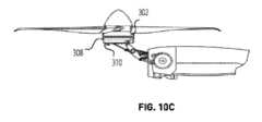 インバータ336は、調整された電力をティルト機構306に供給するように構成されており、ティルト機構306は、いくつかの例では、前進配置とホバリングまたは垂直飛行配置との間でモーター302を枢動および/または平行移動させるように機能する。ティルト機構306は、図9A~図9C及び図10A~図10Cにより詳細に示すように、モーター302(及び/又はそれに取り付けられたインバータ)の後方/インボード部分又はモーター302の前方/インボード部分に結合することができ、モーター302を航空機の機体に結合する。The inverter 336 is configured to provide regulated power to the tilt mechanism 306, which in some examples functions to pivot and/or translate the