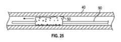 図24~図27は、血栓摘出法の別の例の段階を示している。図24に示されるように、送達システム10の送達デバイス90は、血栓50又は他の塊を含む血管40内の場所に持ち込むことができる。送達デバイス90は、血栓50の上流又は下流に配置することができる。送達デバイス90は、回収デバイスがその中に含まれている間に配置することができる。或いは、送達デバイス90を配置することができ、回収デバイスは、後の段階で送達デバイス90内で前進させることができる。送達デバイス90は、ガイドワイヤ及び/又は1つ又は複数の他のデバイスの助けを借りて配置することができる。24-27 show steps in another example of a thrombectomy procedure. As shown in FIG. 24, the