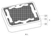 図2は、本願の一実施形態による放熱アセンブリ2の3次元構造の概略図である。図2に示してあるように、放熱アセンブリ2は、要素1に接触するように構成されたヒートスプレッダ21;ヒートスプレッダ21の位置を制限するように構成されたフレームボディ22、ここでフレームボディ22は、ヒートスプレッダ21の側壁を取り囲んでいる;フレームボディ22に固着接続された弾性構造部23、ここで弾性構造部23は、ヒートスプレッダ21のうちの、接触予定の要素1から離れる方に向いた側面に位置している、を含んでよい。2 is a schematic diagram of a three-dimensional structure of a