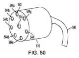 偏向機構は、曲げ部分600および曲げ部分602の近位にある細長いシャフト12の一部分614の複数の偏向の方向を提供するように構成され得る。例えば、シース610の形態での偏向機構は、シース610が上に延在する細長いシャフト12の一部分の周りに回転するように構成され得る。このような回転は、細長いシャフト12を引っ張りつなぎ綱612の種々の位置に向けて偏向させるために、細長いシャフト12に対する引っ張りつなぎ綱612の位置を移動させることができる。それによって、細長いシャフト12の様々な偏向の方向が結果的に生じることができる。例えば、図13Dは、曲げ部分600が偏向させられ得るのに向かう方向605と反対である複数の方向を(矢印を介して)示している細長いシースの正面図を示している。The deflection mechanism may be configured to provide multiple directions of deflection of the