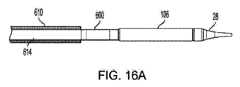 図14Aは、細長いシャフト12の上に延在するシース610の斜視図を示している。シース610は、図1に示されたシース51の代わりに、または、シース51との組合せで、利用できる。シース610は遠位端616と近位端618とを有し得る。シース610の近位端618は、細長いシャフト12の周りでのシース610の回転を制御するために利用され得る回転制御ハウジング620に結合され得る。外科医または他の使用者などの使用者は、細長いシャフト12の周りでのシース610の回転を制御することで、シース610によって引き起こされる細長いシャフト12の偏向の方向を制御するために、回転制御ハウジング620を把持することができる。シース610の近位端618は偏向制御ハウジング622に代替または追加で結合することができ、偏向制御ハウジング622は、シース610を偏向させるために引っ張りつなぎ綱612を近位へと引くために利用でき、また、シース610を真っ直ぐにするために引っ張りつなぎ綱612を遠位方向に解放するために利用できる。偏向制御ハウジング622は、外科医または他の使用者などの使用者がシース610を把持して制御するように構成され得る。FIG. 14A shows a perspective view of a