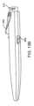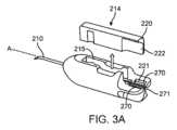 カートリッジ200の近位部分207から遠位方向外側に延びるカートリッジ200のシャフト210(本願では、イントロデューサーチューブ、アプリケータ、導管、または送達体とも呼ばれる)は、長手方向軸Aに沿って延びる少なくとも一部分を含む。シャフト210の少なくとも別の部分は、長手方向軸Aから離れる遠位曲がりまたは屈曲を形成できるように、角度を付けたり、湾曲したり、または柔軟にしたりできる。いくつかの実例では、シャフト210は、部分の相対位置に応じてシャフトの形状が変化するように、柔軟な部分と硬質部分とを含むことができる。図3A~図3C、図7A~図7Cに示す実例は、長手方向軸Aに沿って延びる近位部分と、長手方向軸Aから離れて下方に湾曲する遠位端領域212とを有する。遠位端領域212は、ステント105が展開される管腔238からの開口部230を含むことができる。管腔238からの開口部230は、シャフト210の遠位端領域212の長手方向軸Aの平面に垂直な平面内に位置することができる。管腔238からの開口部230は、シャフト210の遠位端領域212の長手方向軸Aに対して或る角度をなす平面内に位置することができる。シャフト210の遠位端領域212は、管腔238への開口部230が円形ではなく細長くなっており、シャフト210の最遠位先端216が開口部230を越えて延びるように、面取りされる(beveled)ことができる。シャフト210の最遠位先端216は、尖った先端または、先端を形成しないように角張った鈍い先端にすることができる。開口部230の形状は、遠位端領域212におけるシャフト210の全体的な断面の機能(function)であることができるとともに、遠位端領域212の長手方向軸Aに対する開口部230の角度の機能にすることができる。例えば、シャフト210の遠位端領域212が長方形の断面を有し、開口部230が長手方向軸Aに対して垂直に切断されている場合、開口部230とシャフト210の断面形状とは、実質的に一致する。シャフト210が長方形の断面を有し、開口部230が長手方向軸Aに対して垂直よりも短く切断されている場合、開口部230は、シャフト210の長方形の形状に比べて細長い長方形の形状を有していてもよい。開口部230はまた、斜角(bevel)のヒール付近の第1の形状と、最遠位先端216付近の第2の形状とを有してもよい。例えば、斜角のヒール近くの開口部230は丸くして、最遠位先端216近くの開口部230は四角形にしてもよい。開口部230は、シャフト210の最遠位端にある必要はないことも理解されるべきである。開口部230は、ステントが管腔238の長手方向軸に対して角度を有する方向に沿って管腔238の外に付勢されるように、シャフト210の側壁に形成されることができる。開口部230は、シャフト210の前端、下側、上側、および/または別の側に位置するように、カートリッジ200に対してシャフト210に位置することができる。シャフト210の遠位端領域212は、円形、楕円形、丸みを帯びた長方形、丸みを帯びた四角形、四角形、菱形、涙滴形、または他の形状である断面形状を有することができ、最遠位先端216は、鈍い先端、弾丸の先端、ヘラ状の先端、または尖端などの変化する先端形状を有することができる。シャフト210の遠位端領域は、眼科において知られている様々な構成のうちのいずれかを有することができる。The