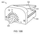 図15A~図15Bは、切断アセンブリ500を有する切断デバイス300を示す。切断デバイス300は、切断アセンブリ500を作動させるためにベース509に可動に結合されたハンドル543を含むことができる。例えば、ハンドル543は、ベース509の切断面513に対して切断ダイ511を昇降させるように構成される。切断面513は、物質のパッチ(図示せず)を保持するように寸法構成される凹部544を含むことができる。切断面513は、凹部544内に物質のパッチ101を配置するために凹部544を露出させるように、ベース509に対して移動可能にすることができる。切断デバイス300は、上述したように、切断面513に対する切断ダイ511の位置を調整するように構成されたダイヤル、ボタン、スライダ、スイッチ、または他のタイプのアクチュエータなどのアクチュエータ545を組み込むことができる。アクチュエータ545は、ネジまたは他の機構を介してベース509を左右に動かして、凹部544内に保持された物質のパッチ101の切断ダイ511に対する位置を変え、それによってパッチから切断されるステントの幅を変更できる。あるいは、アクチュエータ545は、切断ダイ511を凹部544に対して移動させてステントの幅を変えることができる。切断デバイス300は、ベース509から離れるようにスライド、旋回、または持ち上げなどによってベース509に対して移動可能であるように構成されたステージ546を組み込むことができる。いくつかの実例では、ステージ546は、少なくとも部分的にベース509に接続されたまま、下にあるベース509に対して単一平面内でスライドできる。あるいは、ステージ546は、ベース509から完全に取り外すことができる。ステージ546をベース509に対して相対的に動かすと、切断ダイ511およびハンドル543が位置するデバイスの領域の下から凹部544を露出させることができる。これにより、切断アセンブリ500の構成要素がユーザーの視界を妨げたり、物理的なアクセスを妨げたりすることなく、凹部544内にパッチの装填が可能になる。切断デバイス300は、ソロカッターにすることができ、圧縮機構や保持機構、搬送機構を組み込む必要はない。むしろ、切断アセンブリ500での切断に続く切断されたステント105は、シャフトを通じた展開のために切断されたステント105をプライミングするための別のツールに手動で移送されることができる。15A-15B show a