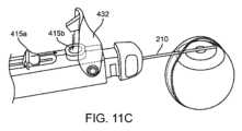 本願の他の箇所で述べたように、カートリッジは、切断デバイス300による切断のために物質のパッチ101を保持するように構成される必要はない。むしろ、切断デバイス300は、切断のために物質のパッチ101を保持して、切断されたステントを切断デバイス300に結合されているカートリッジに移送するように構成されることができる。図10A~図10Cは、眼への挿入前に切断されたステントが装填されるシャフト210を有するノーズコーン274を形成するカートリッジ200の実例を例示する。ノーズコーン274は、切断デバイス300に可逆的に結合でき、切断されたステントが装填されると、切断デバイス300から取り除かれて送達デバイス400に結合できる。カートリッジ200は、物質のパッチ101を保持し、それをステント105に切断するように構成された切断デバイス300に対して位置決めできる。切断デバイス300とカートリッジ200との間の結合は、切断されたステント105が、以下でより詳細に説明されるロッドまたは他のツールを用いるなどして遠位のシャフト210内に移送されるように、切断デバイスの領域に対して遠位のシャフト210の長手方向軸を位置合わせできる。ステント105がその内部に位置した遠位のシャフト210を有するカートリッジ200は、切断デバイス300から結合解除され、送達デバイス400の一部分に移送されることができる。カートリッジ200は、切断のための物質のパッチ101を保持するように構成された部分を含む必要はなく、代わりに、切断デバイス300の領域および送達デバイス400の領域と交互に結合できる移送可能な部分を含む。これについては、後ほど詳細に説明する。As noted elsewhere herein, the cartridge need not be configured to hold the patch of