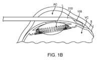 図1Aおよび図1Bは、人間の眼の前眼房ACと硝子体部VCを示す断面図である。ステント105は、ステント105の少なくとも第1の部分が前眼房AC内に位置して、ステント105の第2の部分が毛様体上腔内および/または脈絡膜上腔内などの組織内に位置するように、移植位置において眼の内部に位置することができる。ステント105は、このような構成で位置するように寸法および形状が構成される。ステント105は、前眼房ACから離れる(例えば、毛様体上腔および/または脈絡膜上腔へ)房水の流れのための通路を提供するか、さもなければ、そのような通路として機能する。図1Aおよび図1Bでは、ステント105は、送達シャフト210に対して細長いボディとして模式的に示されている。ステント105の寸法および形状は変えることができることは理解されるべきである。さらに、送達シャフト210内への挿入前のステント105の寸法および形状は、送達シャフト210への挿入時に変化することができて、送達シャフト210から展開した後に変化できる。1A and 1B are cross-sectional views showing the anterior chamber AC and vitreous body VC of a human eye. The