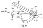 図4Hは、ハンドル343がベース302に向けて下方に付勢される間(例えば、刃344が移植体105に対して切断構成に位置する)、切断デバイス300のプッシャー320がベース302を通じて遠位に進むことができることを示す。図4Iは、プッシャー320が近位端の凹部221内にステント105を係合させる準備ができていることを示す。図4Jは、プッシャー320がカートリッジ200のシャフト210の管腔238の中に遠位方向にステント105を進ませることを示す。上述のように、側面の刃344、上のカバー214および下の突起271は、切断されたステント105のための完全な囲いを全ての側部に作り、ステント105がこの遠位前進の間に管腔238内で座屈することを防止する。ステント105が保持される導管は、移植されるステントの外形寸法に合うように寸法構成(または小さめに寸法構成)されており、それによって、ステント105がプライミングされた位置に付勢される際に座屈およびしわの発生を防止する。Figure 4H shows that the