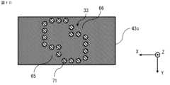 実施の形態2に係る多層基板12について説明する。図9は実施の形態2に係る多層基板12の概略を示す断面図で、図6のA-A断面位置と同等の位置で多層基板12を切断した図、図10は図9のB-B断面位置で切断した多層基板12の断面図で、中間誘電体層43cの部分の断面図、図11は図9のC-C断面位置で切断した多層基板12の断面図で、中間導体層25bの部分の断面図である。実施の形態2に係る多層基板12は、複数のビアホール71により導波管33が形成された構成になっている。