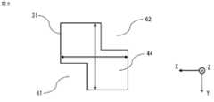 本願の要部である導波管31の構成について説明する。導波管31における中間誘電体層43を貫通した方向に対して垂直な断面の形状は、四角形の1つの対角線上の角部の双方が切り欠かれた形状である。切り欠かれた部分を、切欠き部61、62と称する。図3に示した導波管31における中間誘電体層43を貫通した方向に対して垂直な断面の切り欠かれた部分の形状は、四角形である。切欠き部61、62の形状は、正方形でもよく、図4に示すように、長方形であっても構わない。導波管31の断面の四角形が正方形であり、切欠き部61、62が正方形の場合、切り欠きを設けた対角線とは反対側の対角線に対して切欠き部61、62は対称に配置される。導波管31の断面の四角形が正方形であり、切欠き部61、62が長方形の場合、切り欠きを設けた対角線とは反対側の対角線に対して切欠き部61、62は非対称に配置される。<